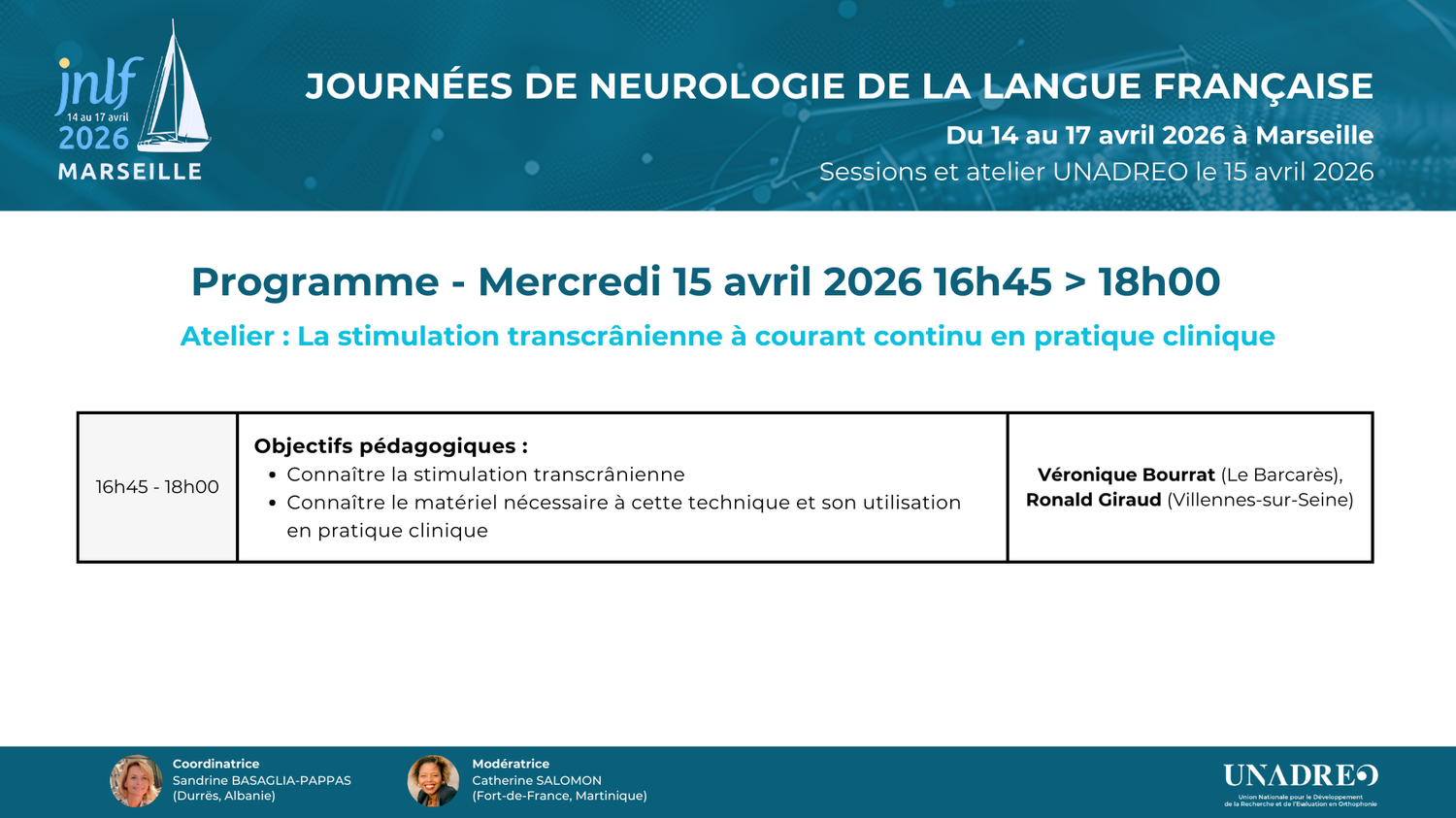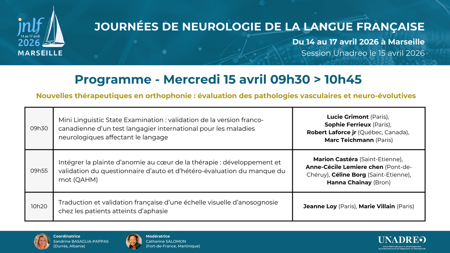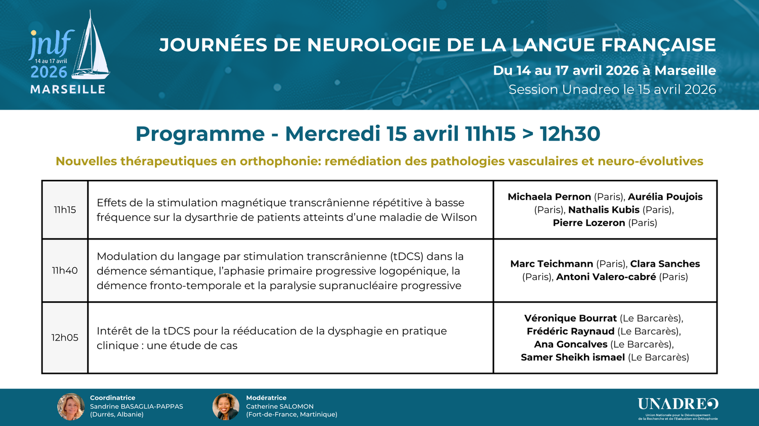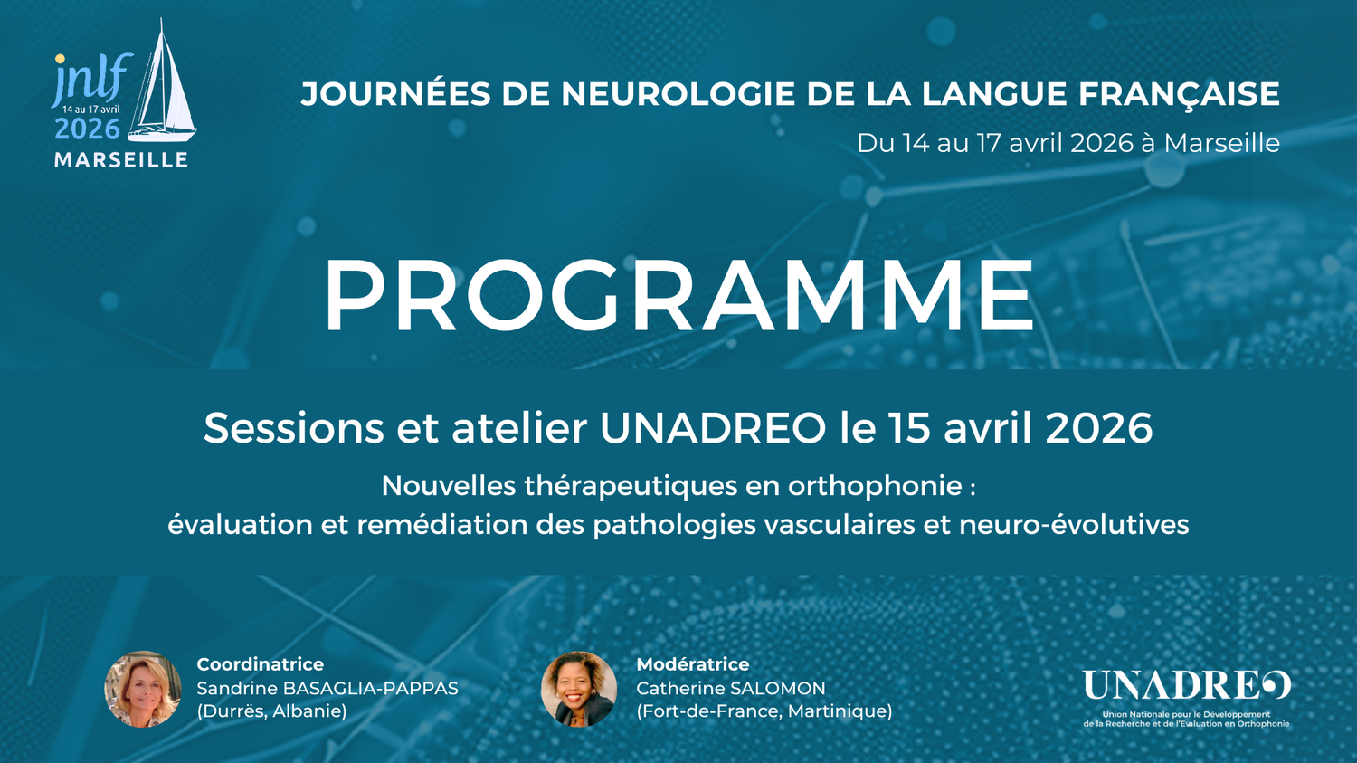 16 Déc JNLF 2026 – Session Unadreo – Avril 2026 Posted at 15:18h in CONGRÈS, COLLOQUES, JNLF by unadreo UNADREO FORMPrésentation d’UNADREO FORM Les Rencontres internationales d’orthophonie UNADREO Rencontres 2024 Rencontres 2025 Rencontres 2026 Ecole d’été 2022 Lyon DAYS 2025 AUTRES EVENEMENTSJNLF LURCOWebinaires LURCO Les JNLF 2026 auront lieu à Marseille du 14 au 17 avril 2026. La réunion paramédicale de l’Unadréo – Session orthophonie aura lieu le 15 avril 2026 Programme PDF Session UNADREO INSCRIPTION Programme PDF JNLF Programme de la session UNADREO 2026