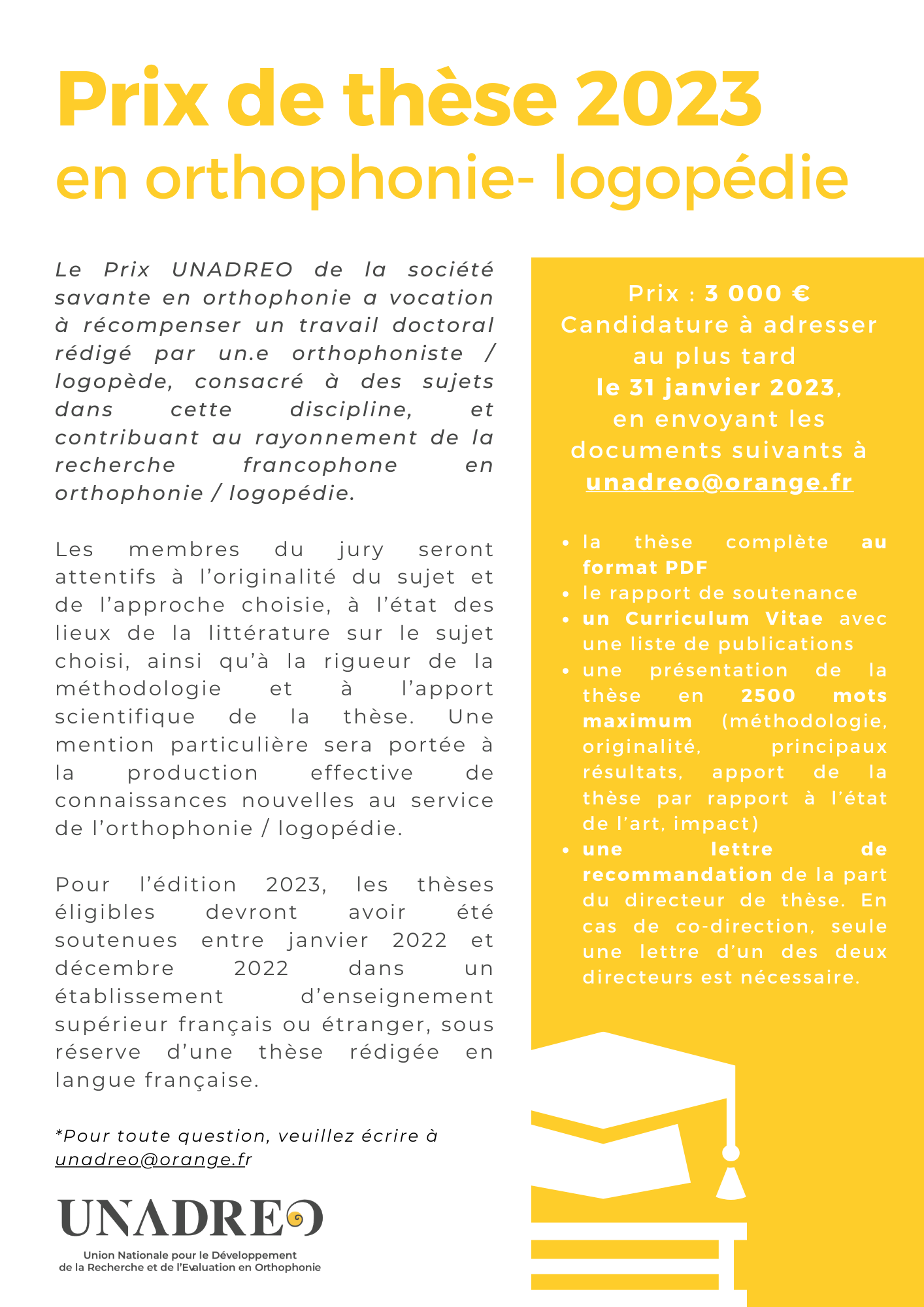 20 Sep Prix de thèse 2023 Posted at 18:58h in INFORMATIONS, Prix de thèse by unadreo PrixPrix de thèse Concours Mémoires d’orthophonie