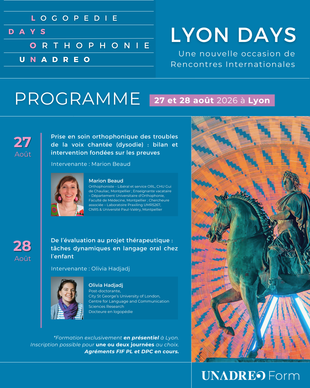 L’UNADREO Form organise les 27 et 28 aout 2026 les LYON DAYS, une nouvelle occasion de Rencontres Internationales à LYON, qui se veut un lieu d’échanges et de réflexion sur la pratique clinique, alimenté par les données récentes de la recherche.